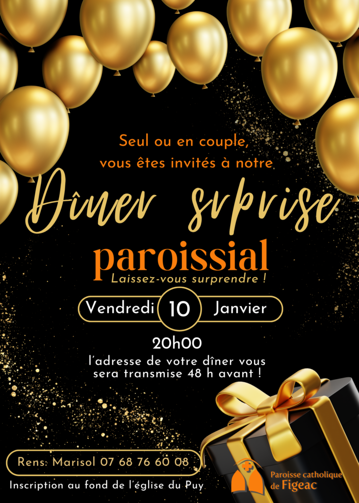 Un dîner surprise paroissial…pour vous ! Une initiative pleine de surprise pour rencontrer les autres ! Inscrivez-vous vite dans l’église du Puy, ou contactez Marisol au 07 68 76 60 08