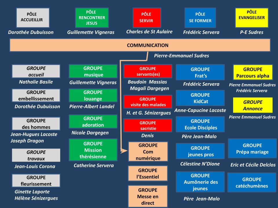 La paroisse a ainsi été amenée à repenser son organisation autour de 5 pôles : inviter, prier, servir, se former, évangéliser, et propose aujourd’hui plus de 20 groupes qui œuvrent à cette mission exaltante (accueil, embellissement, adoration, louange, parcours alpha, visite aux malades, fraternités, …)