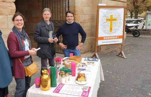 Entre 10h00 et 12h00, l’équipe s’installe sur le parvis avec café et délicieux gâteaux confectionnés par les paroissiens.
